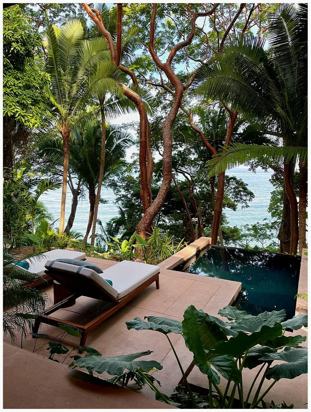 I stayed in Ocean Treehouse #327 perched hidden within the jungle including views of the ocean in the distance. I loved the location of this treehouse...I felt hidden at the end of a cul de sac like road. The layout and décor of this treehouse was so on point! Spaciously everything made sense with the layout and made for a nice flow. Indoors I had 3 seating areas which were well thought out and nice: the desk area...2 chairs and table in the “living area” and the daybed which separated the bathroom from the main area of the room. The bathroom was a wonderful size including a private water closet, spacious double vanity, HUGE shower area and a doorway to an outdoor tub perfectly situated for a relaxing bath. The interior design was sleek and modern but was so comfortable and really has a “sense of place”. The size of the outdoor terrace was absolutely perfect! There was room for a double lounger, a nice sized heated plunge pool and a table with 2 chairs that is perfect to begin the day with a private breakfast.